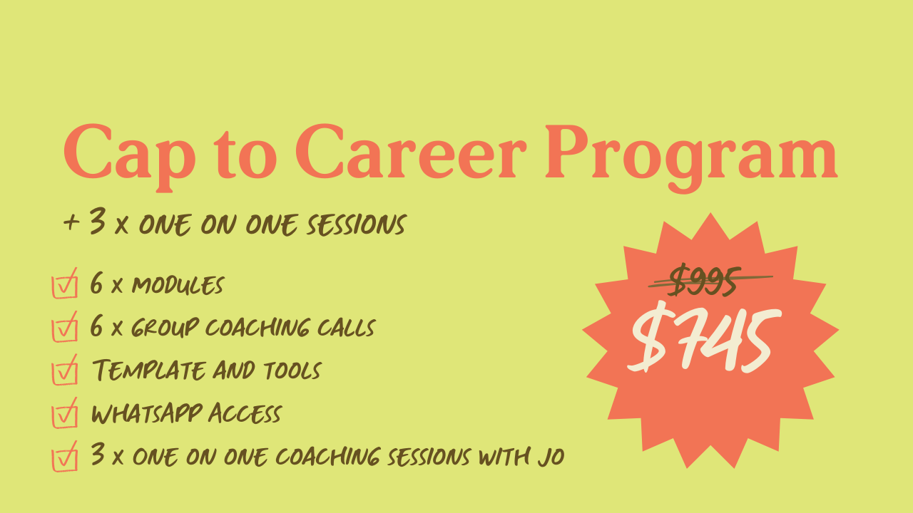 Kickstart your career with confidence! The 6-week Cap to Career Program gives you the tools, strategies, and personalised coaching to transition from uni to industry with clarity and confidence.